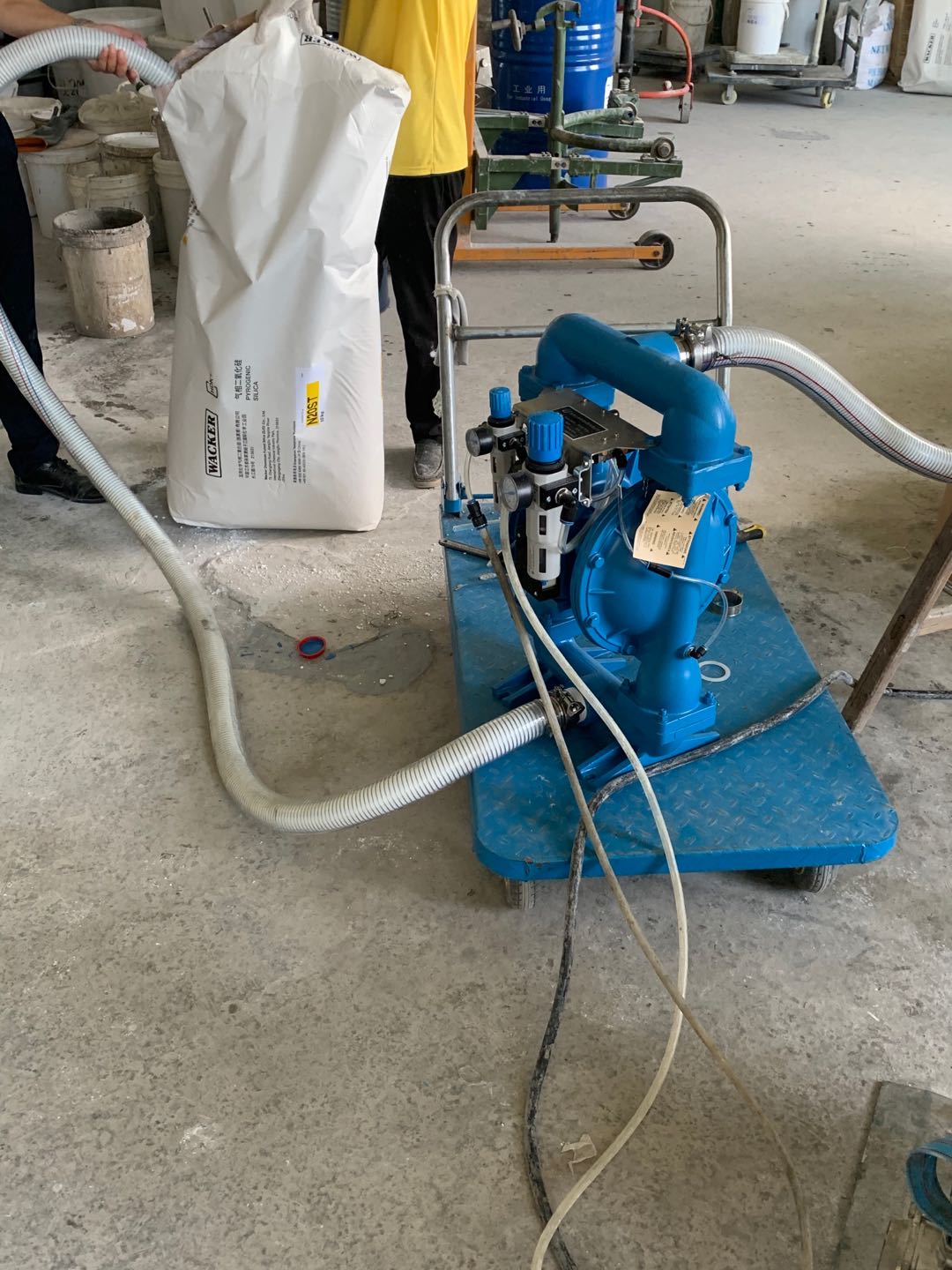 a、 安装极为方便,体积小,泵的出料口可以与其它设备的入口用软管联接(也可以用硬管)。泵的进料口可以 自吸粉料,以微正压状态输出,进入密闭的设备中,少量的气体经过空气释放组件排出;